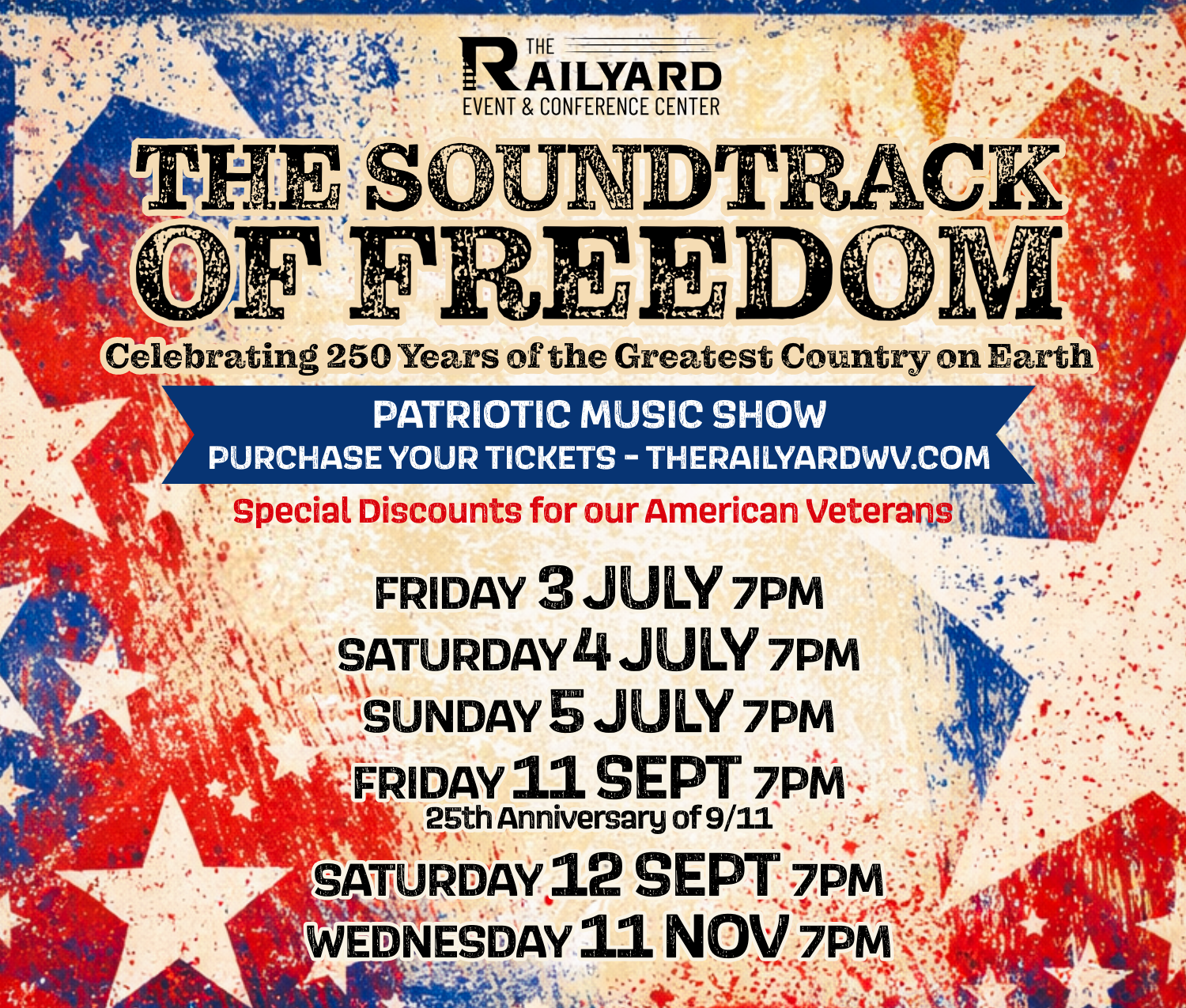 Experience a bold, patriotic tribute at The Railyard Event & Conference Center as the RailSide Revue presents The Soundtrack of Freedom—a high-energy salute to the songs that shaped a nation.